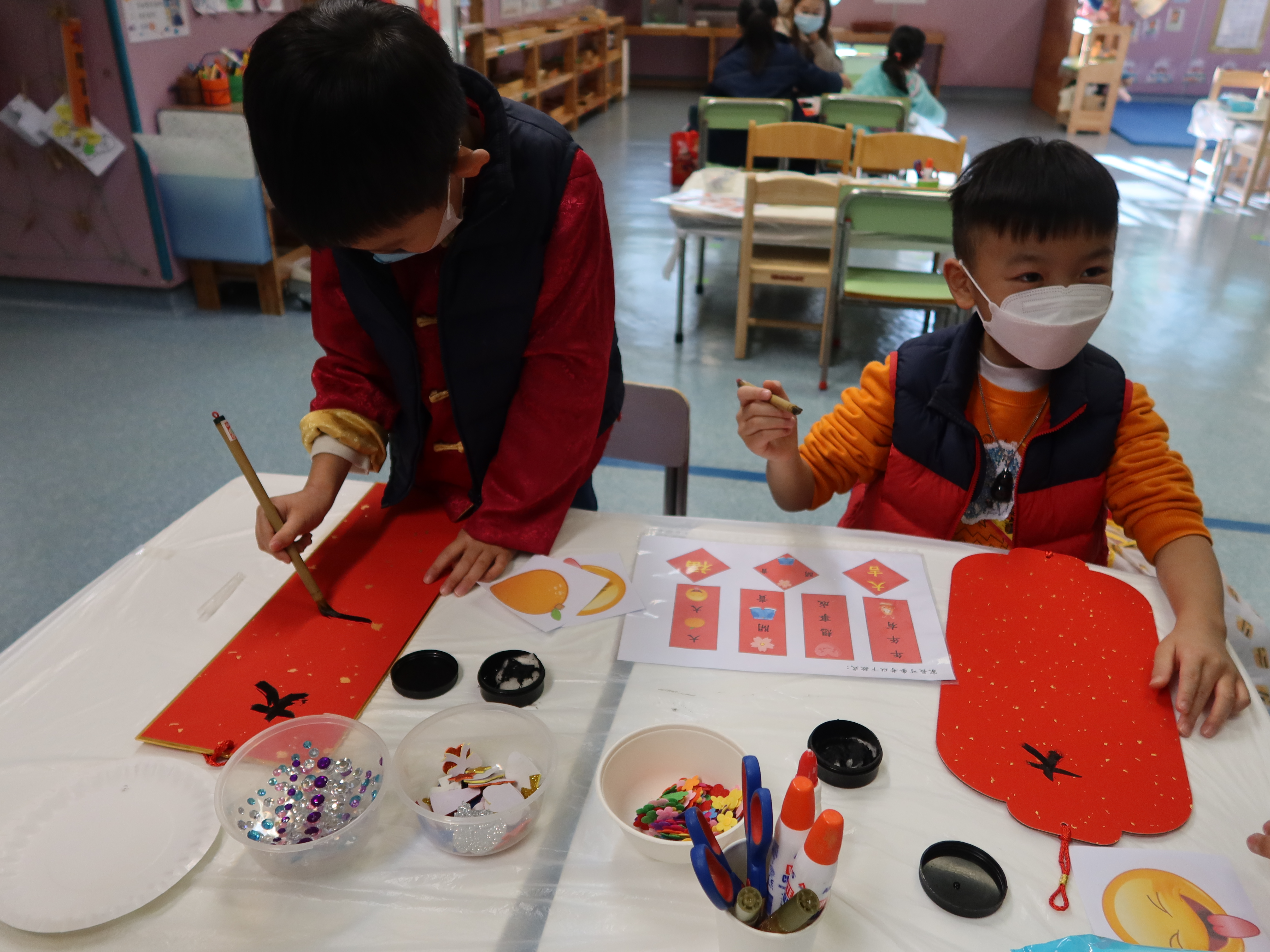 在農曆新年前,學校邀請了家長到校與幼兒一起製作揮春,用毛筆、墨硯書寫揮春,並一起用圖工材料裝飾揮春來佈罝家居;另外,家長與幼兒一起挑選材料製作中國傳統節慶食物:湯丸,回家後一起進食湯丸,感受中國傳統節慶的活動和氣氛。家長與幼兒也很投入和享受活動的過程和樂趣呢!
